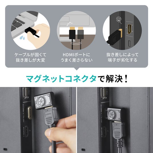 HDMIケーブルが固くて抜き差しが大変、テレビやモニターの裏のHDMIポートにうまく挿さらないといったお悩みを解決します。