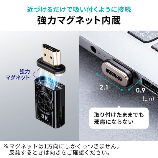 先端のHDMI端子がマグネットで着脱が可能になっており、近づけるだけで吸い付くように接続することができます。