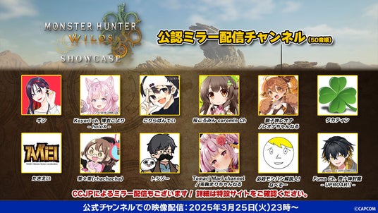 「モンスターハンターワイルズ ショーケース」公認ミラー配信 YouTubeチャンネル(50音順)