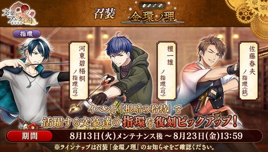 召装『金環ノ理』のラインナップを更新いたしました。この召装では、イベント『調査任務「根暗の矜持」』で活躍する「檀一雄」「佐藤春夫」「河東碧梧桐」の指環を一定の確率で入手できます。