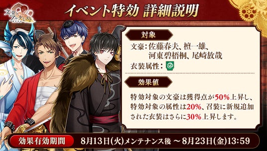 期間中「檀一雄」「佐藤春夫」「河東碧梧桐」「尾崎放哉」の衣装を編成して潜書すると、得点の獲得数がそれぞれ50%上昇します。また、「風」属性の衣装を編成して潜書すると、得点の獲得数がそれぞれ20%上昇します。