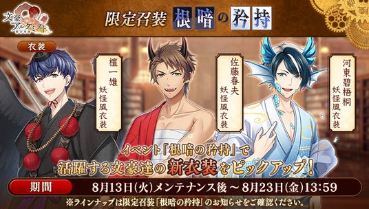 さらに、イベントと同時に開催される限定召装『根暗の矜持』にて新規追加された「檀一雄」「佐藤春夫」「河東碧梧桐」の〈妖怪風衣装〉を編成すると、得点の獲得率がそれぞれ30%上昇します。