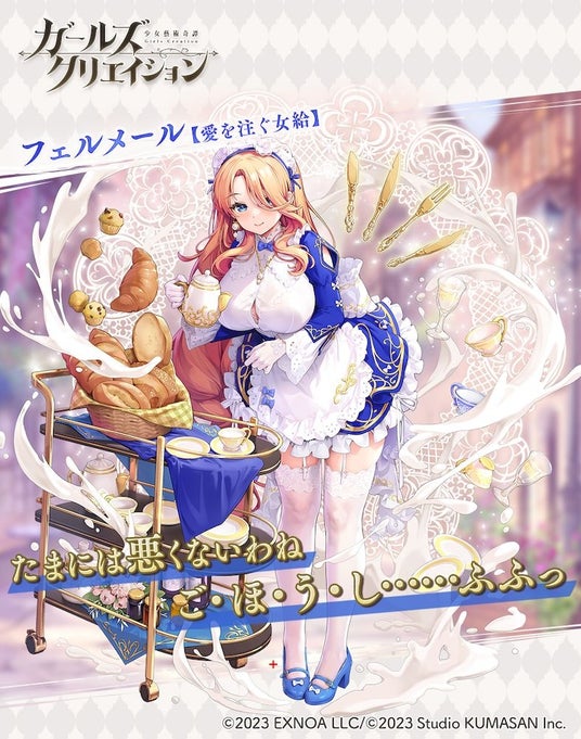 合同会社EXNOA(本社:東京都港区、CEO:村中 悠介、URL:https://games.dmm.com/)が運営するDMM GAMESにおいて、「クリエイティブチーム くまさん」第4弾作品となる『ガールズクリエイション -少女藝術綺譚-』(以下、『ガールズクリエイション』)にて、イベント「悪事を暴け!美少女メイド奮闘記」の開催、メイド服姿のブグロー★5スタイル【ランドリーメイド】とフェルメール★5スタイル【愛を注ぐ女給】が新登場のピックアップガチャの開催をお知らせいたします。
