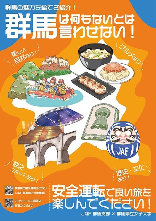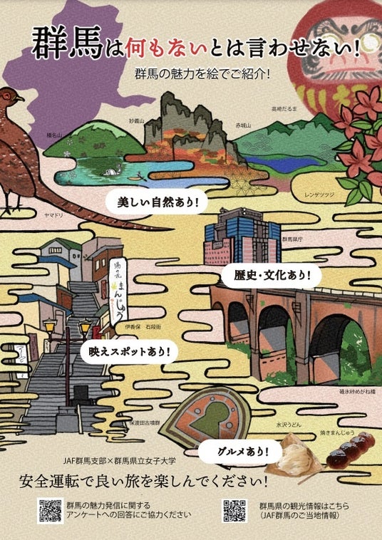 今回は、新たにチラシを作成し、イラストを通じて群馬県の特徴や観光の魅力を伝えます。チラシに掲載の二次元コードから、地域の情報を発信しているウェブサイト「JAF群馬のご当地情報」をご覧いただける他、群馬県に関するアンケートのご案内を掲載し、群馬の魅力や課題などについてのご意見を伺うことで、今後の取り組みに活かします。