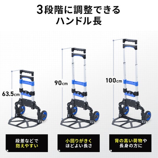 ハンドル部分は3段階で調整可能で、身長や荷物の高さに合わせて快適に使用できます。