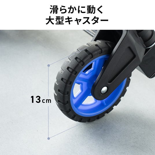 キャスターは直径13cmと大きめで、静音設計になっており、スムーズな移動を実現します。凹凸のある地面や舗装されていない場所でも、ストレスなく移動が可能です。軽やかな動きで、重い荷物も楽に運ぶことができます。