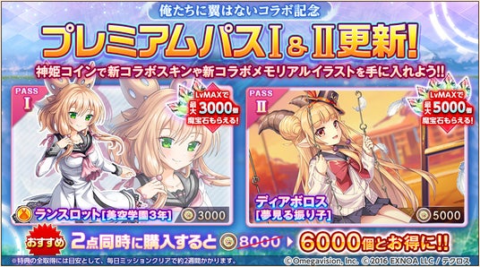 神姫コインで購入できるプレミアムパスI・IIの追加特典には、なんとコラボ衣装をまとったキャラの英霊スキンやメモリアルイラストも!