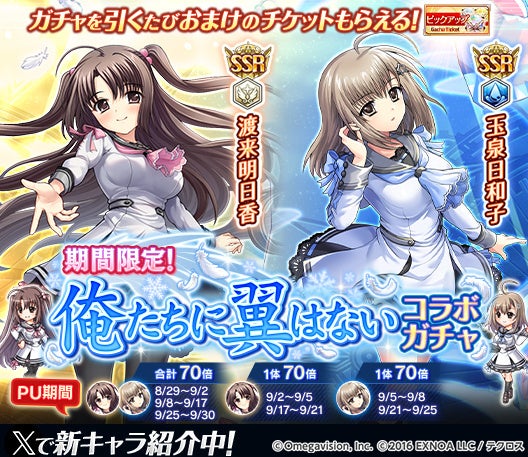 合同会社EXNOA(本社:東京都港区、CEO:村中 悠介、URL:https://games.dmm.com/)が運営するDMM GAMESにおいて『神姫PROJECT』は、『俺たちに翼はない』との期間限定コラボキャラ「渡来明日香」「玉泉日和子」が新しく登場することを発表した。さらにコラボイベントや最大320連の毎日無料10連ガチャを開催。9月2日よりプレミアムパスの特典が更新される。