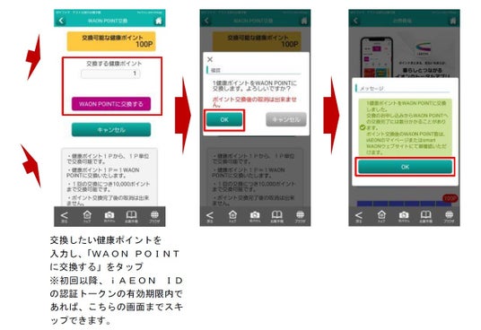 この度、“健康ポイント”をiAEON上で“WAON POINT”に交換いただけるようになります※1)。1健康ポイント=1WAON POINTから交換可能で、貯まったWAON POINTを「WAON(電子マネー)」に交換すると1ポイント=1円相当でご利用できます。健康食品や衛生用品に限らず、食品や衣料品などのお買物にもご利用可能になります。