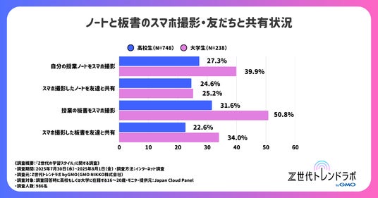・大学生の半数が授業の板書をスマホで撮影、3割超が友人と写真を共有。