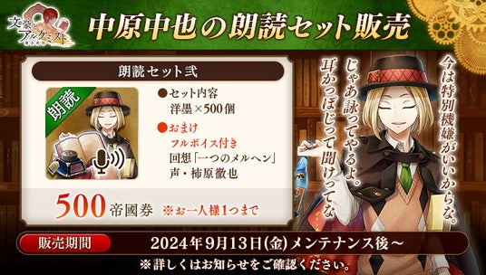 期間中「室生犀星」「織田作之助」「中原中也」「宮沢賢治」の衣装を編成して潜書すると、得点の獲得数がそれぞれ50%上昇します。また、「水」属性の衣装を編成して潜書すると、得点の獲得数がそれぞれ20%上昇します。