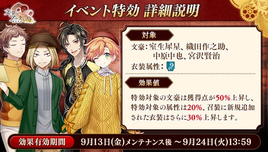 さらに、イベントと同時に開催される限定召装『推し事の流儀』にて新規追加された「室生犀星」「織田作之助」「中原中也」の〈秋洋服〉を編成すると、得点の獲得率がそれぞれ30%上昇します。