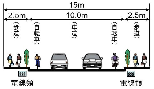 このうち、本事業は、上記の施行箇所において、幅員約11mの道路を15mに拡幅整備するものです。車道は2車線、その両側に歩道及び自転車通行空間を整備します。また、無電柱化や街路樹の植栽を行います。