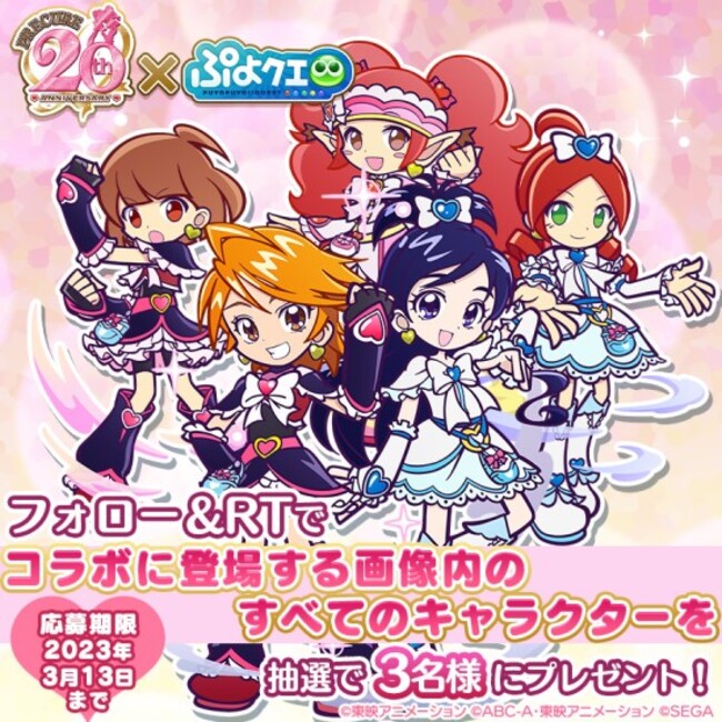 株式会社セガは、大好評配信中のパズルRPG『ぷよぷよ!!クエスト』にて、2023年3月3日(金)より、テレビアニメ『プリキュア』シリーズとのコラボレーションイベントを開催します。
