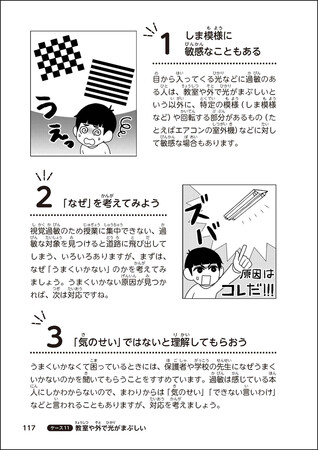 漫画では多くの困りごとの例を挙げています。たとえば、話をやめられない、こだわりすぎる、怒りをおさえられない、忘れ物が多い、姿勢が悪い、感覚過敏がある(光に敏感、音に敏感、肌が敏感)、眠れない、お金を使いすぎる、ゲームがやめられない、読み書きが苦手など。それぞれには理由があり、子ども自身のやる気の問題ではないことを解説し、工夫できることや練習方法を紹介しています。