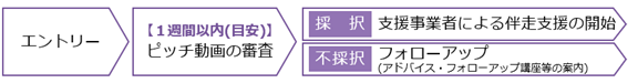 ・1週間以内(目安)に審査結果を通知。採択された場合には、支援事業者からの伴走支援がスタート((2)参照)