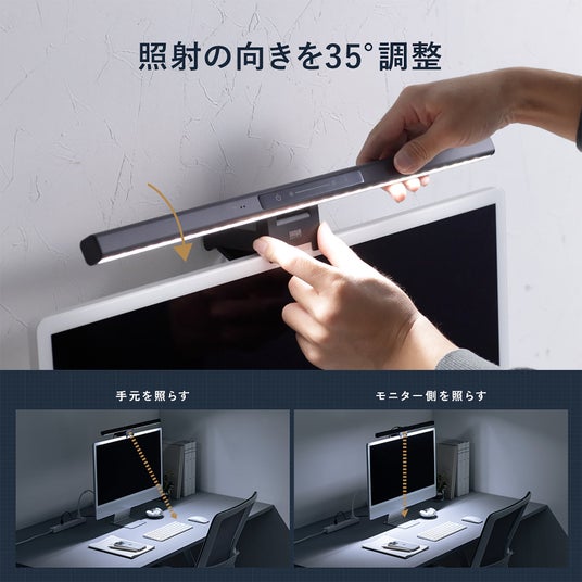 照射の向きを35度調整可能です。そのため手元、モニター側を照らすなどシーンに合わせて調整できます。