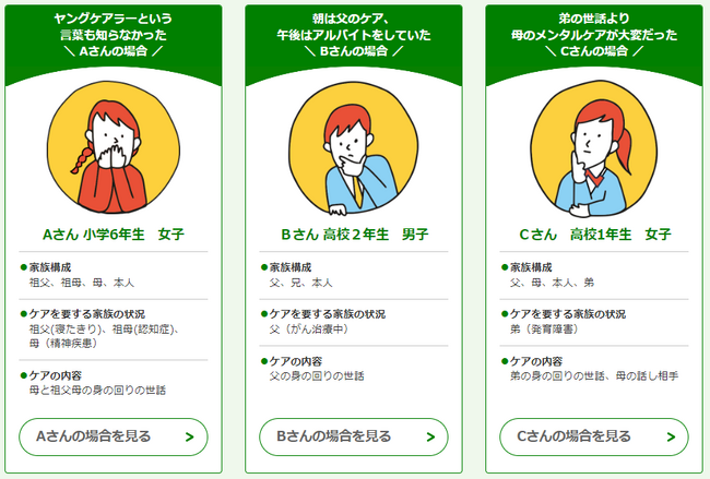 ヤングケアラーが抱えている状況について、支援内容等も交え、事例形式で紹介しています。