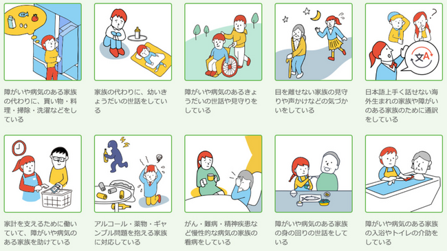 ヤングケアラーの多様な状況について、イラスト等を用いて視覚的にも分かりやすく紹介しています。