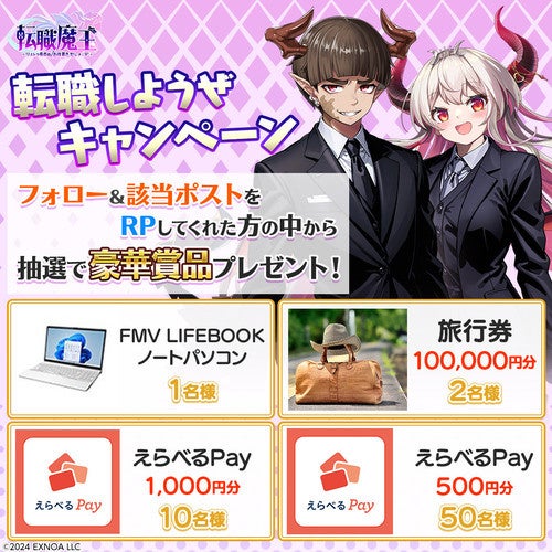 合同会社EXNOA(本社:東京都港区、CEO:村中 悠介、URL:https://games.dmm.com/)は、『転職魔王~リストラ勇者のお仕置きセレナーデ~』(以下、『転職魔王』)にて豪華賞品が当たるキャンペーンの開催をお知らせいたします。