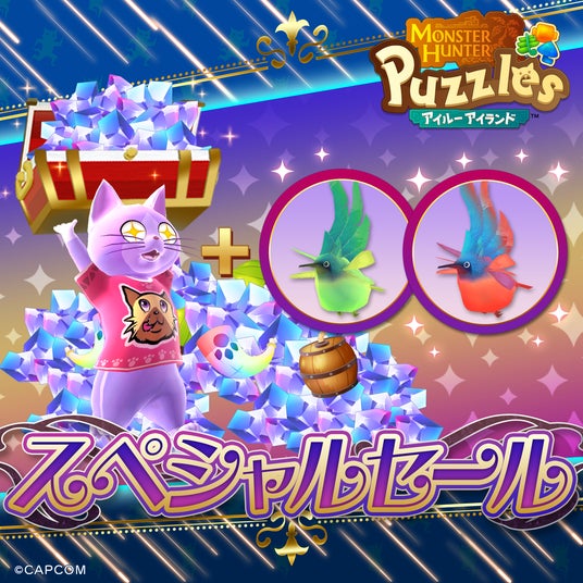 iOS/Android『モンスターハンターパズル アイルーアイランド』は、本日2025年5月21日(水)より、「お宝パック・ビッグ」「お宝パック」にヒトダマドリのチャームが追加されるスペシャルセールを開催いたします。