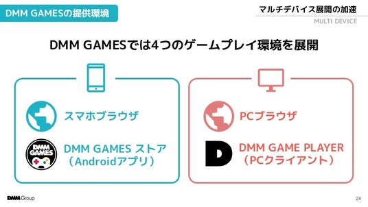 DMM GAMESでは、「PCブラウザ」「DMM GAME PLAYER(PCクライアント)」「スマホブラウザ」「DMM GAMES ストア(Androidアプリ)」の4つの環境を展開しており、クラウドゲーミングの強化やiOSアプリストアの検討など、今後さらにマルチデバイス環境を拡げてまいります。