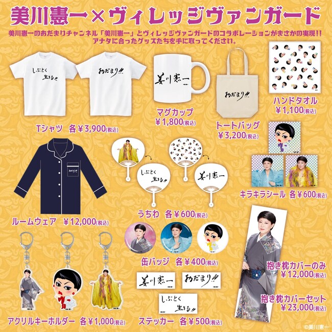 2023年10月20日(金)より、美川憲一のおだまりチャンネル【美川憲一】とヴィレッジヴァンガードのまさかのコラボグッズが発売決定!美川憲一ファン待望のグッズが完成しました!缶バッジやアクリルキーホルダーなどの小物グッズから、ルームウェアや抱き枕まで、おすすめグッズが盛りだくさん!! 11月5日(日)23:59までの期間限定受注販売のため見逃し厳禁!限定グッズを手に入れよう!