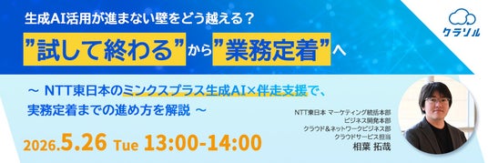 本セミナーでは、生成AI活用を“試して終わる”状態から脱却し、実務に定着させたい企業様に向けて、NTT東日本の「ミンクスプラス生成AI」と伴走支援をもとに、実務定着までの進め方を解説します。