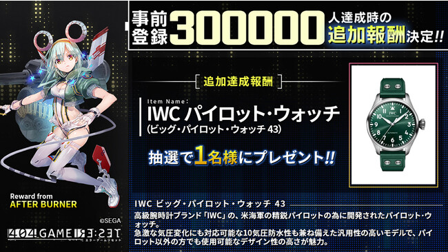 事前登録30万件突破時の追加報酬が決定しました。30万件突破により全員配布の報酬「ジェム」1,500個に加え、「アフターバーナー賞」として「IWC ビッグ・パイロット・ウォッチ 43」を抽選で1名様にプレゼントします。まだ事前登録されていない方は、ぜひご参加ください。