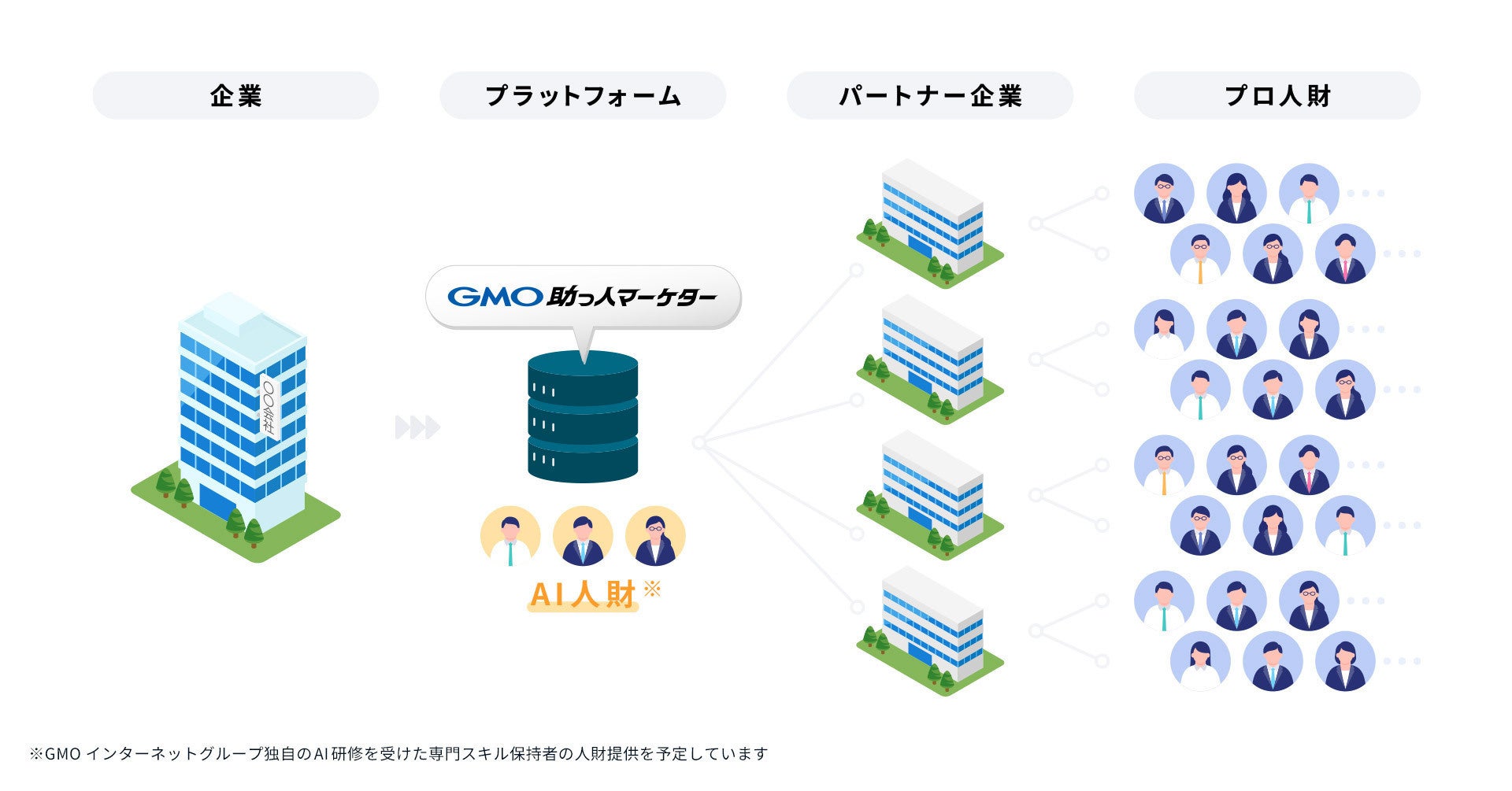 「GMO助っ人マーケター」は、デジタルマーケティング領域において人財不足に悩む企業に、即戦力となるプロフェッショナル人財をシェアリング形式でご紹介するサービスです。広告代理店のデジタルマーケティング部門を対象としたマッチングを皮切りに、今後は広告主企業のマーケティング部門への展開も予定しています。