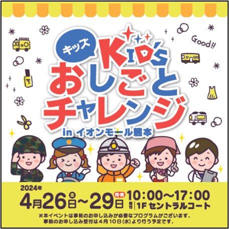 JAF熊本支部(支部長 與縄 義昭)は4月27日(土)、熊本県嘉島町にて開催される「キッズおしごとチャレンジinイオンモール熊本」にJAFブースを出展します。