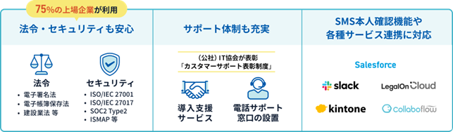 電子帳簿保存法や建設業法などの各種法令に加え、国内外の第三者機関によるセキュリティ認証の取得により、高い安全性を評価されているほか、SMS本人確認機能や他の業務サービス・基幹システムとの連携に加え、導入時の支援サービスや、誰もがご利用いただける電話サポート窓口の設置等、サポート体制も充実しています。