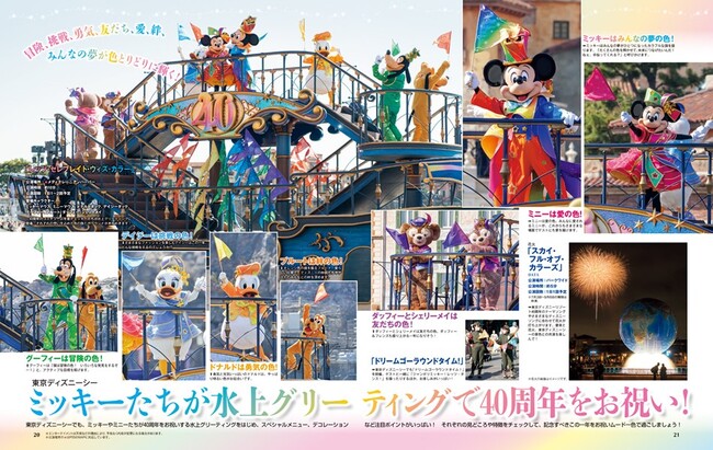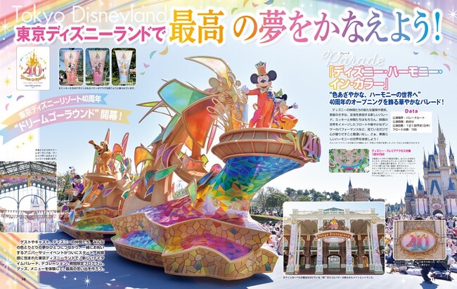 巻頭ページでは、新デイタイムパレード「ディズニー・ハーモニー・イン・カラー」を中心に、東京ディズニーランド(R)で過ごす40周年のお楽しみを徹底紹介。東京ディズニーランドで最高の夢をかなえよう!