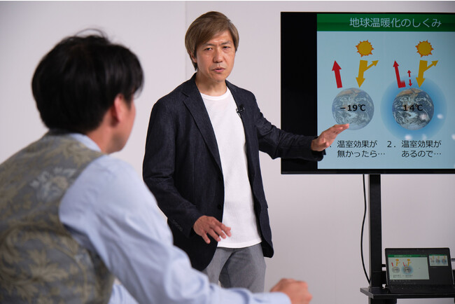 しかし、そもそも地球温暖化とはどういう状況なのか。そこで田津原理音さんが、気候変動について多く発信している東京大学/国立環境研究所の江守正多さんからレクチャーを受け、地球にはびこる「気候変動モンスター」を見つけていこうとしているのだ。