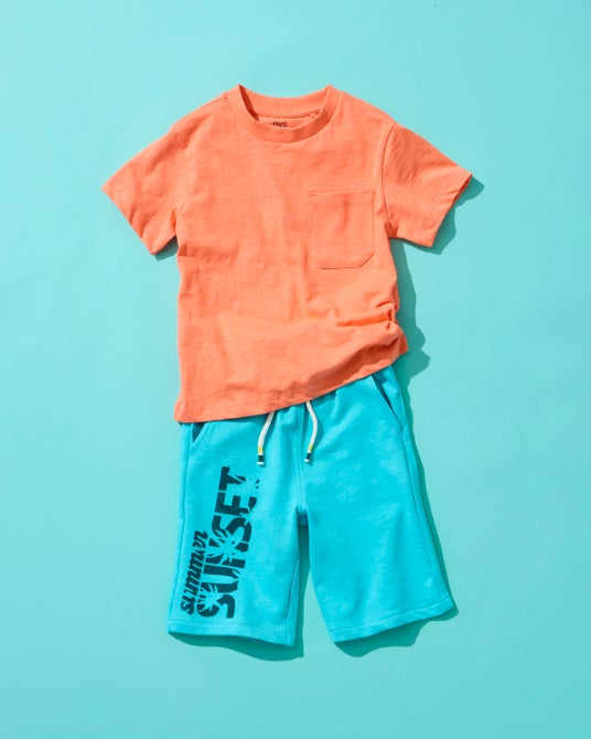 スラブ天竺綿Tシャツ・フロッキープリントショートパンツ