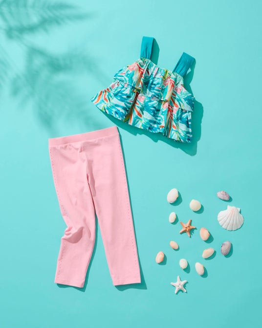 リゾート感たっぷりの段切替のキャミソールと、サイドのラインストーンがポイントのレギンスのコーディネートです。
