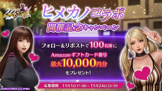 人気作品の『ヒメカノ』とのコラボレーションを記念して、抽選で合計100名様にゲーム内に最大10,000円分のAmazonギフトカード番号が当たるキャンペーンを実施致します。