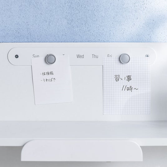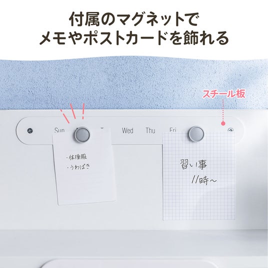 付属のマグネットでメモやポストカードを飾ることができます。さらに、スッキリ配線できるケーブル通し穴付きで、タブレットなど充電が必要な機器も綺麗に配線することができます。