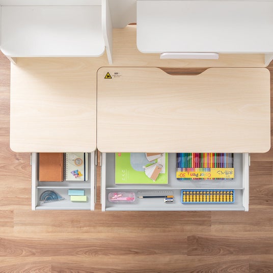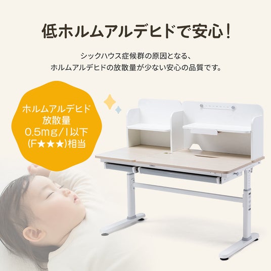 デスクの天板には低ホルムアルデヒドの素材を採用。F☆☆☆相当の安全基準を満たしており、お子様の健康にも配慮されています。高品質の仕上がりで、安心して長くお使いいただけます。