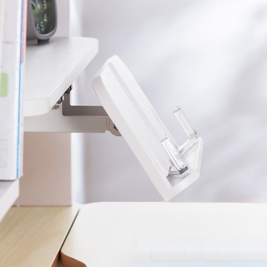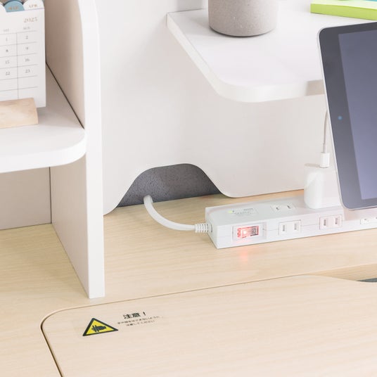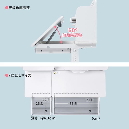 天板は最大50°まで角度調整が可能。読書や書き物、タブレット使用時に最適な角度を選べます。また、ガスシリンダー式の安全設計で、急な天板の降下による指挟みを防止。安心してお使いいただけます。