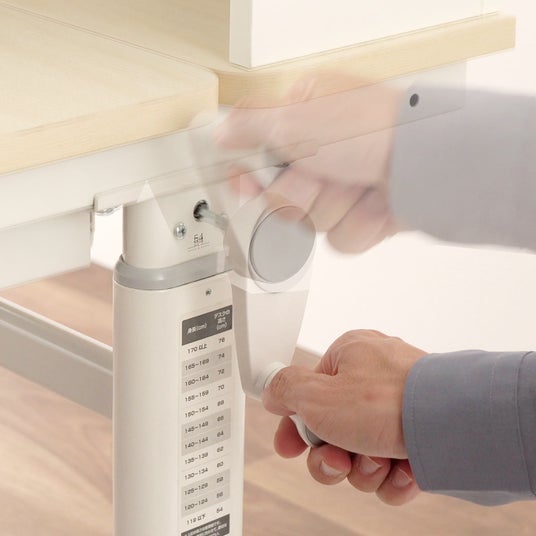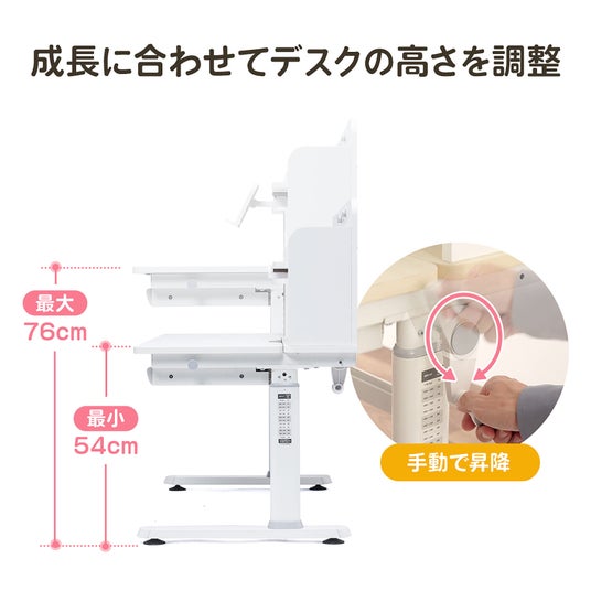この学習机は、手動昇降式のハンドルを回すだけで高さを54cmから76cmまで調節可能。お子様の成長に合わせて快適な学習環境を維持できます。さらに、ハンドルは取り外し可能で、いたずら防止にも配慮されています。