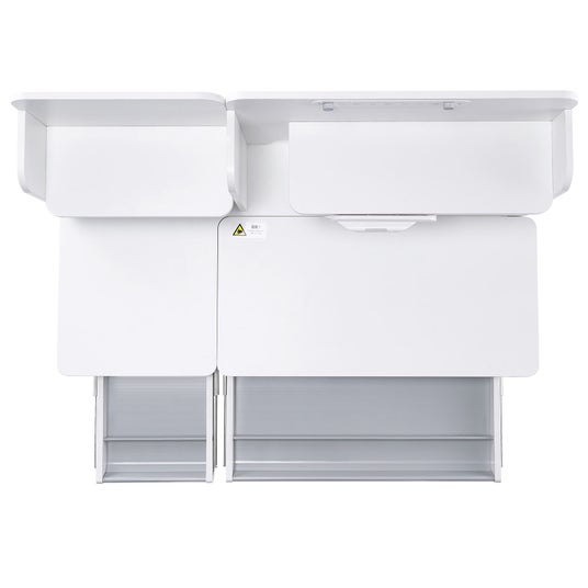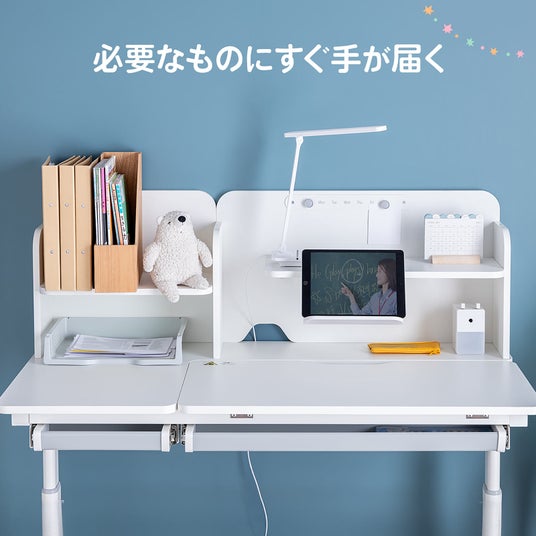 天板下には小物収納引き出し、側面にはバッグフックを搭載。本や文房具を整理できるシェルフも標準装備。タブレットホルダー付きで、デバイスも目線の高さに設置可能です。お部屋をすっきり整えながら学習効率を高めます。