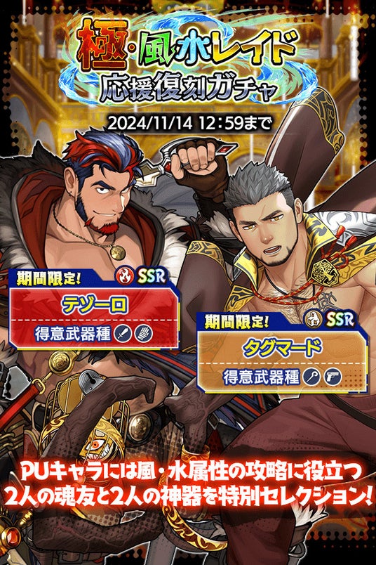 「テゾーロ」「タグマード」など期間限定キャラを含む、過去キャラクターたちが復刻する特別なガチャが開催!風・水属性の攻略に役立つ、2人の魂友と2人の神器がピックアップされた「極・風水レイド応援復刻ガチャ」をお見逃しなく。