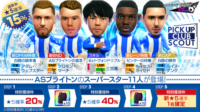 通常枠の★5出現確率が15%! STEP1・STEP 3で「★5選手出現確率UP」、STEP5で「新★5選手1名確定」の特別獲得枠が付きます。
