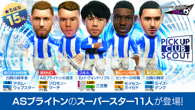 今回の“ピックアップクラブSCOUT”では、「三笘薫」、「ソロモン・マーチ」、「モイセス・カイセド」、「アダム・ウェブスター」、「ルイス・ダンク」、「アレクシス・マック・アリスター」、「エヴァン・ファーガソン」、「パスカル・グロス」、「ペルビス・エストゥピニャン」、「ジョエル・フェルトマン」、「ロベルト・サンチェス」といった、イングランドクラブの「中央突破」を得意戦術とする新★5選手11名が登場します。