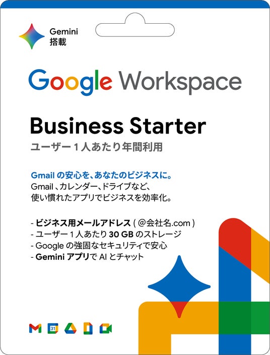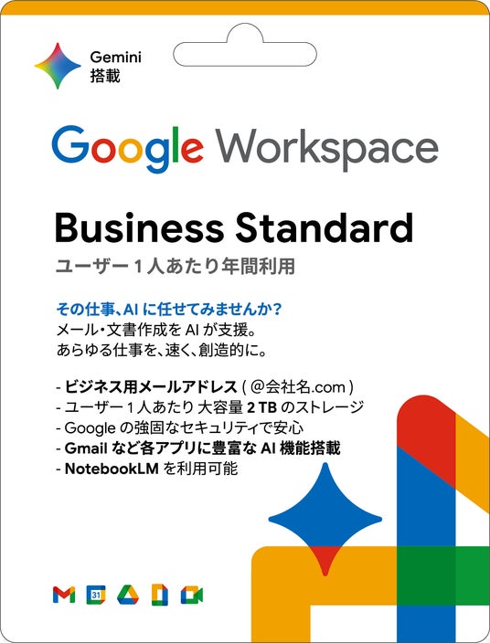 今回販売開始される Google Workspace カードは Google Workspace Business Starter と Google Workspace Business Standard の2種類で、カード1枚につき1ユーザーの登録が可能です(ユーザー登録上限300ユーザー)。利用期間は登録から1年間となり、登録後はクレジットカード等での更新が必要となります。また、 Google の生成 AI Gemini を利用可能(※3)で、AIによるユーザーの業務効率化や生産性向上を実現します。