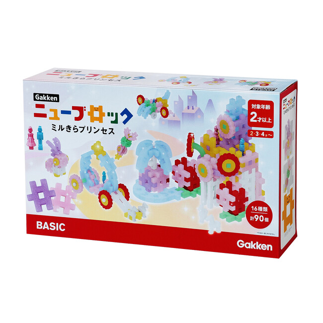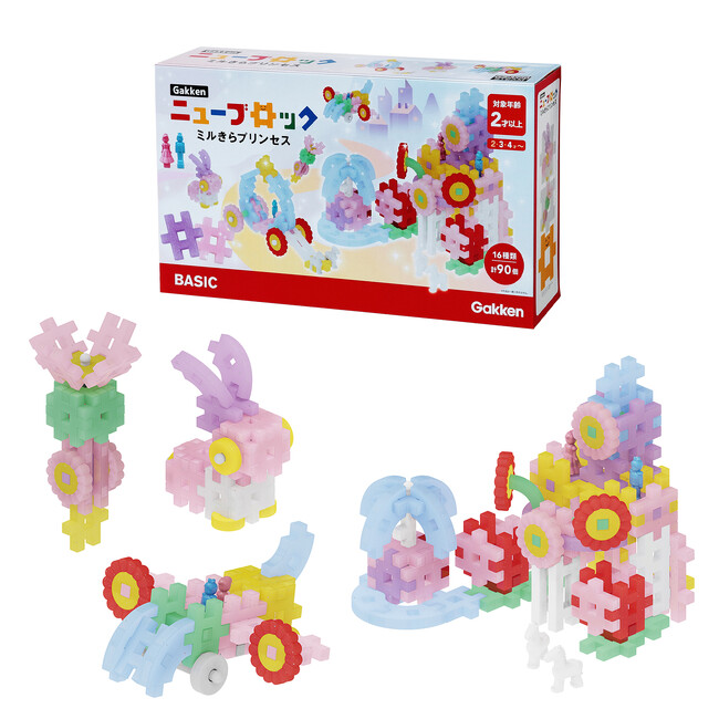 きらきら輝くラメ入りの「きらきらパーツ」と、かわいいパステルカラーの「ミルキーパーツ」がたくさん入った、かわいさ満点のセット。プリンセスとプリンスの人形パーツも入っており、自分で作ったお城や馬車で、想像力を育むごっこ遊びも楽しめます。