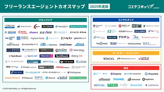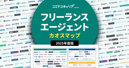 GMOインターネットグループのGMOメディア株式会社(代表取締役社長:森 輝幸 以下、GMOメディア)が運営するフリーランス・転職・副業サービス検索サイト「コエテコキャリア byGMO」(URL:https://coeteco.jp/career)は、2025年11月21日(金)に、フリーランスエージェント市場の最新動向を可視化した2025年版『フリーランスエージェントカオスマップ』を公開しました。