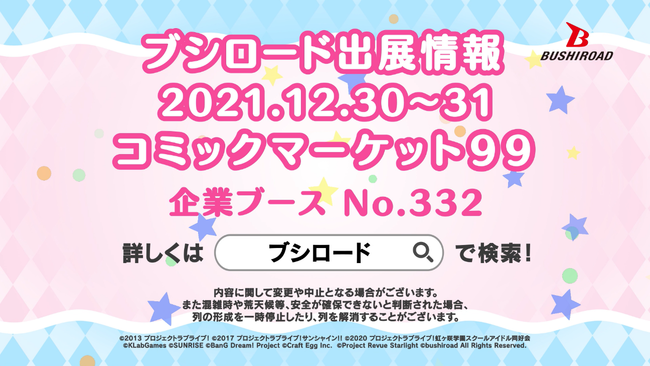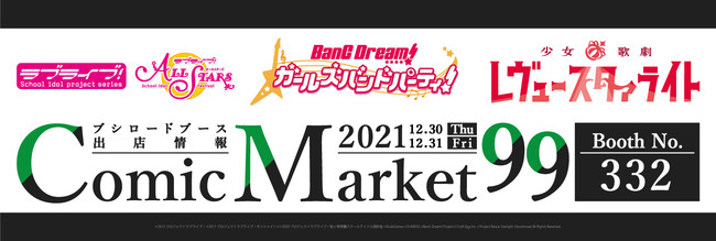 株式会社ブシロード(本社:東京都中野区、代表取締役社長:橋本義賢、以下ブシロード)のグループ会社にあたる株式会社ブシロードクリエイティブ(本社:東京都中野区、代表取締役社長:成田耕祐)は、2021年12月30日(木)~31日(金)の2日間、東京ビッグサイト 西・南展示棟、青海展示棟で開催される「コミックマーケット99」に出展しますことをお知らせ致します。報道関係の皆様におかれましては、ぜひ誌面やWeb媒体で本情報をお取り上げいただけますようお願い申し上げます。
