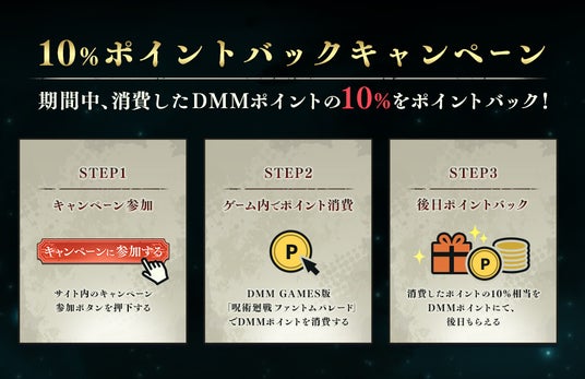 期間中に、キャンペーン特設サイトからキャンペーンへエントリーし、DMM GAMES版『呪術廻戦 ファントムパレード』にてDMMポイントを消費いただいたユーザー様を対象に、消費額の10%を後日DMMポイントにて還元します。